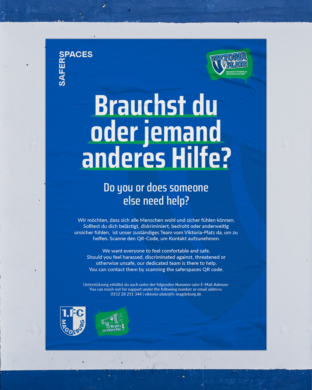 Dafür ist an den Spieltagen das Team vom Viktoria-Platz im Stadion im Einsatz und ansprechbar, welche in FCM-Bekleidung erkennbar sind. Es gibt dazu eine zentrale Telefonnummer und E-Mail-Adresse (siehe Kontaktdaten), die erreichbar für Betroffene ist, welche Unterstützung benötigen. Des Weiteren ist es möglich mit dem Code-Satz „Wo geht’s zum Viktoria-Platz?“ beim Personal im Stadion (FCM-Mitarbeitende, Sicherheitsdienst, Catering-Personal) anonym und ohne weitere Informationen Kontakt zum Team vom Viktoria-Platz aufzunehmen. Darüber hinaus kann über die ausgehangenen QR-Codes der Kontakt zum Team vom Viktoria-Platz aufgenommen werden.