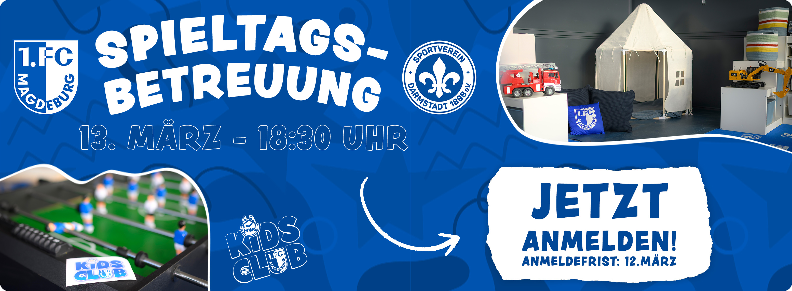 Der KidsClub öffnet an unseren Heimspieltagen die Türen für unsere KidsClub-Mitglieder. Wir freuen uns darauf, eure Kinder am Spieltag bei uns zu begrüßen und betreuen zu dürfen! Damit alles reibungslos abläuft, bitten wir um Voranmeldungen. Diese könnt Ihr über den Link in unserem Newsletter tätigen oder direkt hier über die Buttons unten. Falls Ihr den Newsletter nicht erhaltet, gebt uns bitte per E-Mail (kidsclub@fc-magdeburg.de) Bescheid, sodass wir euch für den Newsletter mit reinnehmen können. Im Anschluss an die Platzbuchung erhaltet ihr umgehend eine Bestätigungsmail.