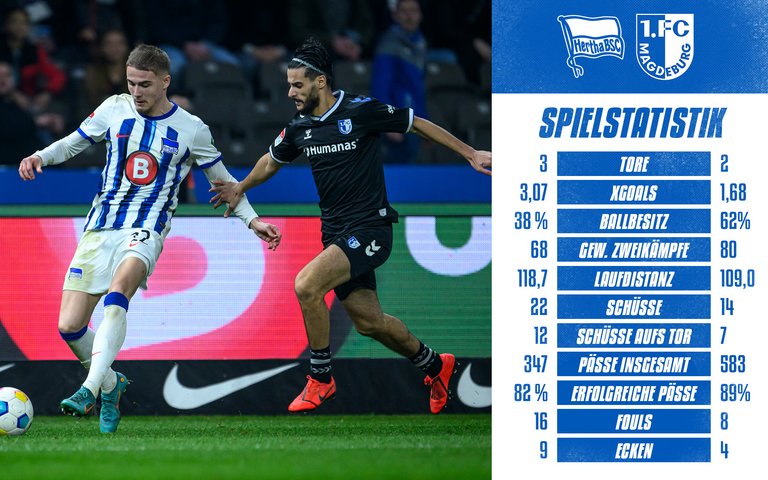 Bei den xGoals hatte Hertha deutlich die Nase vorn (3,07:1,68). Auch bei den Torschüssen waren die Gastgeber besser (22:14). Stärker war unser FCM beim Ballbesitz (62:38 Prozent) sowie bei der Passquote (89:81 Prozent).