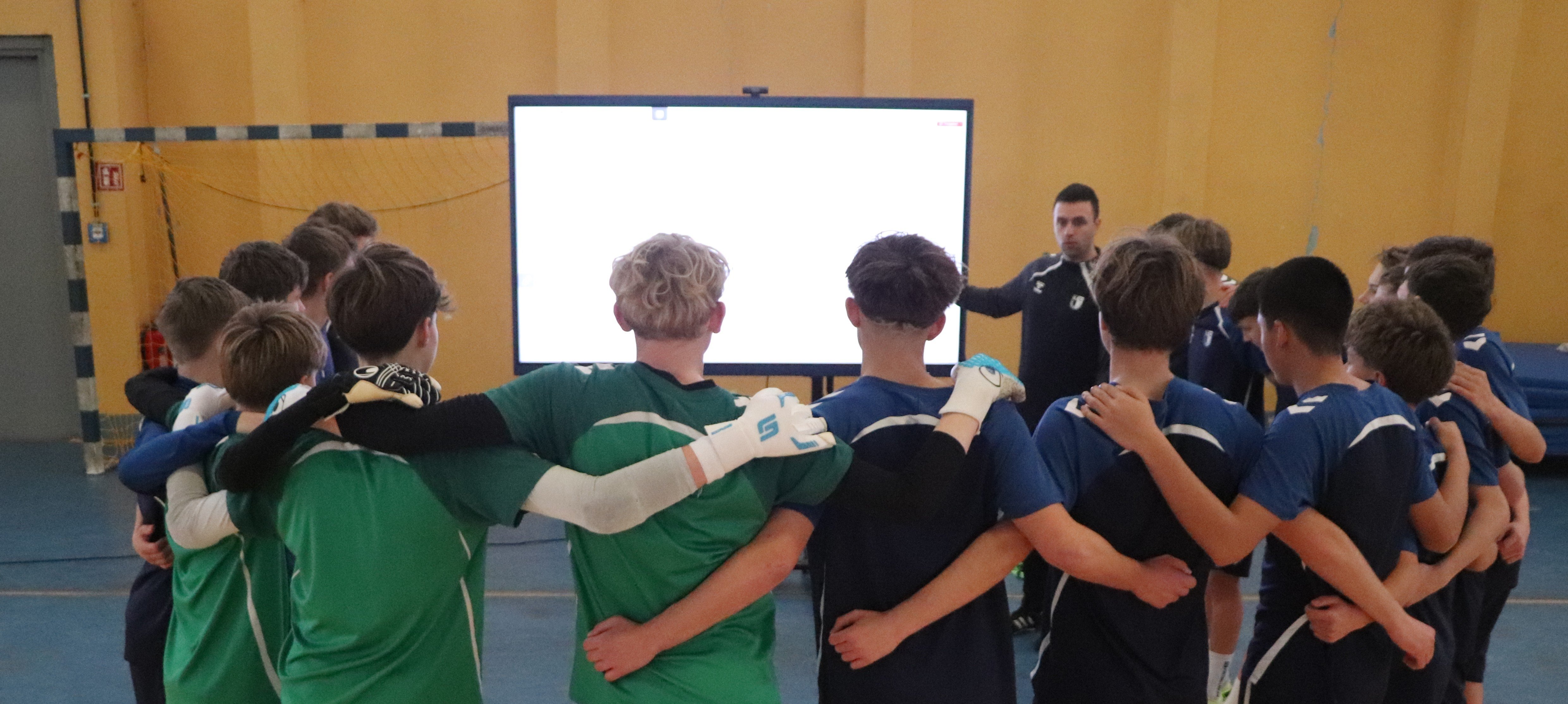 Montagnachmittag in der Mehrzweckhalle an der Magdeburger Friedrich – Ebert – Straße: Die rechte Hallenhälfte verwandelt sich durch fleißige Hände in ein Fußballfeld mit Bande. U15 Co-Trainer Tim Wieblitz rückt die hochkant gestellten Turnbänke exakt zurecht, so dass die siebzehn U15-Kicker „sich wie zu Hause fühlen“, also die Gegebenheiten in der GETEC-Arena simuliert werden. Punkt vierzehn Uhr beginnt die Trainingseinheit, traditionell im Mannschaftskreis. Nach einer kurzen Ansprache gibt U15-Cheftrainer Florian Schröder ungewöhnliche Anweisungen. Die Jungs bilden daraufhin einen engen Kreis, „Kein Blatt passt mehr zwischen euch. Setzt euch nun auf die Knie des Hintermanns …“ Das anfängliche Lachen macht der Erkenntnis Platz, „dass dieser ungewöhnliche Kreis nicht umzustoßen ist. Er zeigt euch, dass jeder von euch gleichwichtig ist, für Teamgeist und Erfolg.“ Florian Schröder versucht, den Kreis instabil zu machen; es gelingt ihm nicht.