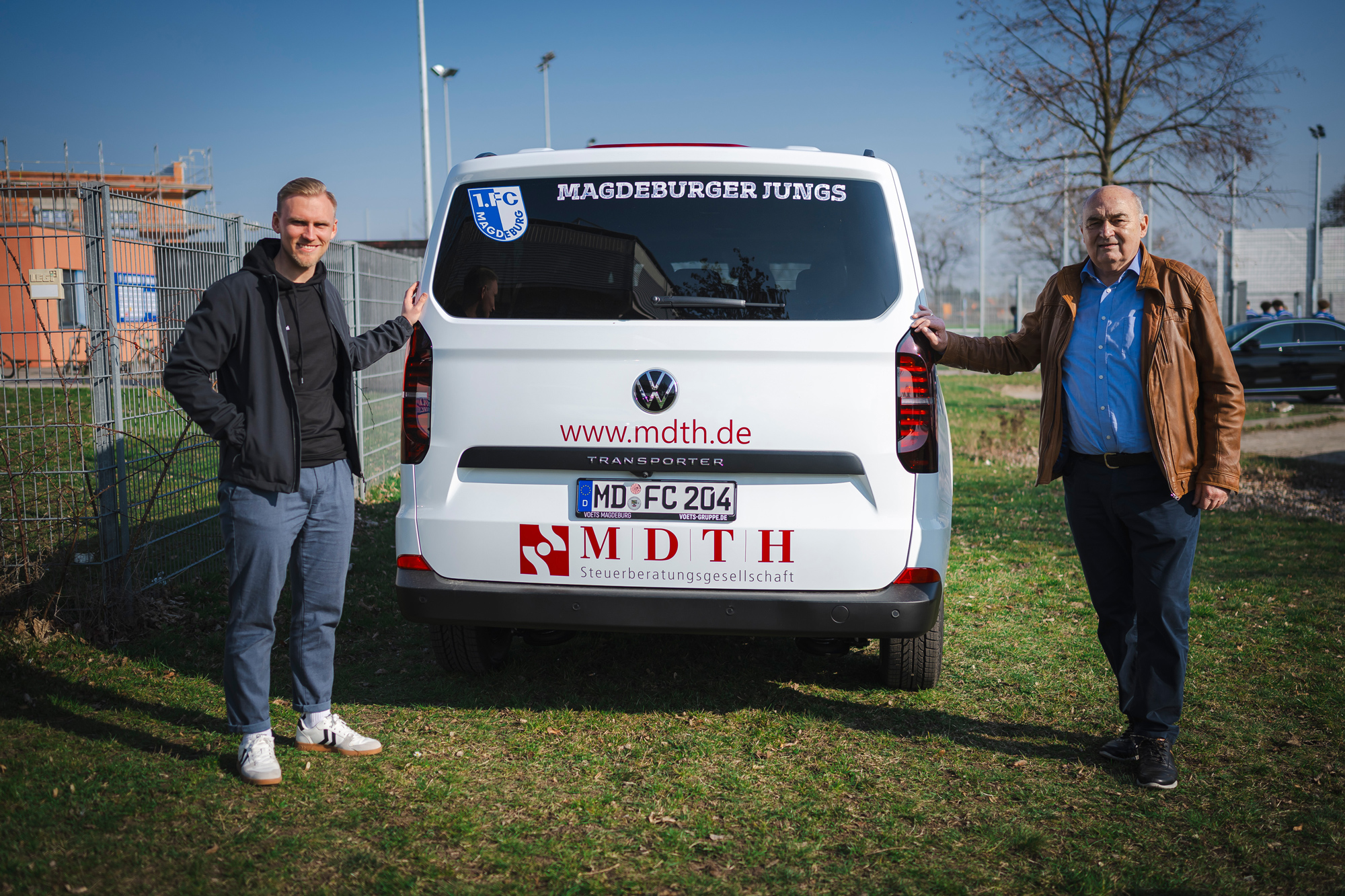 Foto: Sebastian Büttner (Organisatorischer Leiter HB-Immobilien-Nachwuchsleistungszentrum) nimmt den neuen Kleinbus von Rüdiger Deumelandt (Vorsitzender des Fördervereins des 1. FC Magdeburg e.V.) entgegen.