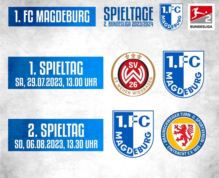 Wir starten am Samstag, 29. Juli, mit unserem Auswärtsspiel beim Aufsteiger SV Wehen Wiesbaden in die neue Spielzeit. Anstoß in der BRITA-Arena ist um 13 Uhr. Eine Woche später empfangen wir Eintracht Braunschweig am Sonntag, 6. August, um 13.30 Uhr in der MDCC-Arena in Magdeburg.