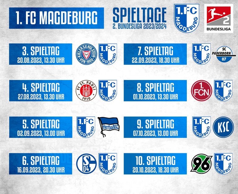 Die Auswärtsspiele in Kiel, bei St. Pauli und in Nürnberg bestreitet der FCM jeweils sonntags um 13.30 Uhr. Gegen Paderborn und in Hannover spielen wir jeweils freitags um 18.30 Uhr. Beim FC Schalke 04 gastiert unser Team zum Topspiel am Samstagabend.