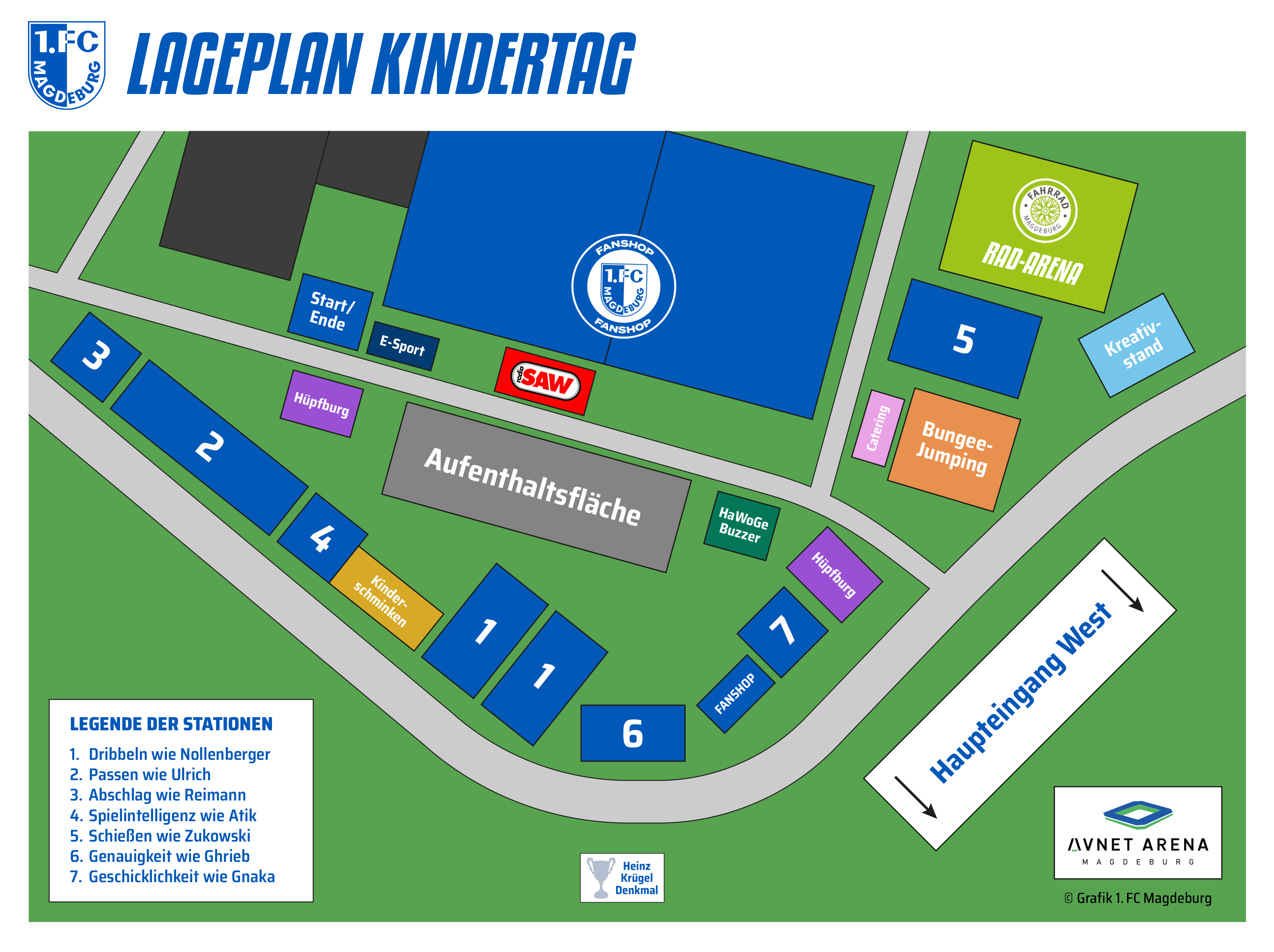 Vor der Avnet Arena auf der Wiese vor unserem Fanshop seid ihr herzlich eingeladen, unsere FCM-Rallye zu absolvieren. Diese findet von 10:00 bis 13:30 Uhr statt. Hier könnt ihr eure Geschicklichkeit, Ballkontrolle und euer Wissen rund um den 1. FC Magdeburg unter Beweis stellen. Mit einer Stempelkarte durchlauft ihr 7 spannende Stationen und erhaltet ab 4 Stempeln eine kleine Überraschung für eure Teilnahme an unserer FCM-Rallye.