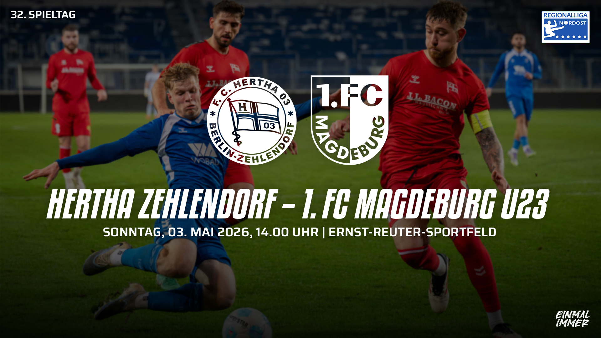 Am 03.05.2026 um 14:00 Uhr findet das Auswärtsspiel unserer U23 in der Regionalligasaison 2025/26 gegen den FC Hertha 03 Zehlendorf im Ernst-Reuter-Sportfeld statt.