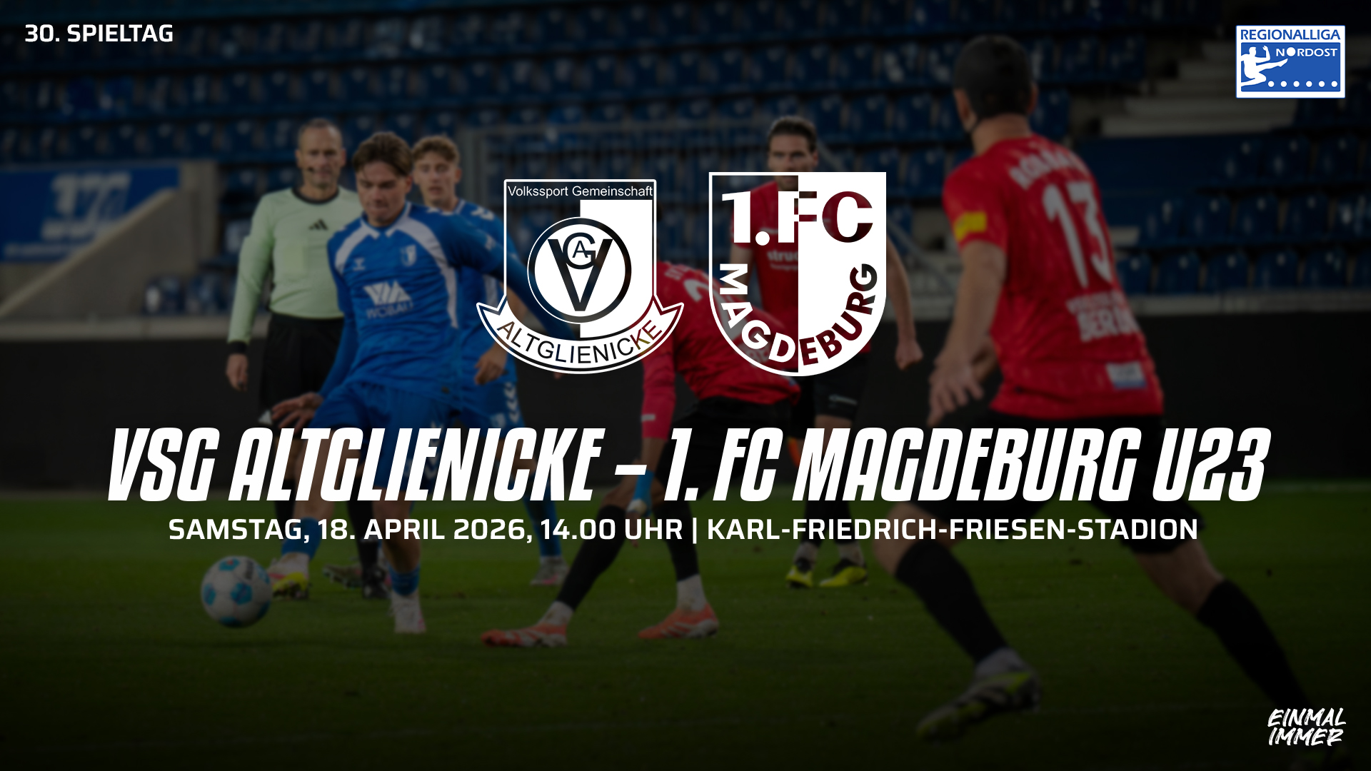 Am 18.04.2026 um 14:00 Uhr findet das Auswärtspiel unserer U23 in der Regionalligasaison 2025/26 gegen die VSG Altglienicke im Karl-Friedrich-Friesen-Stadion statt.